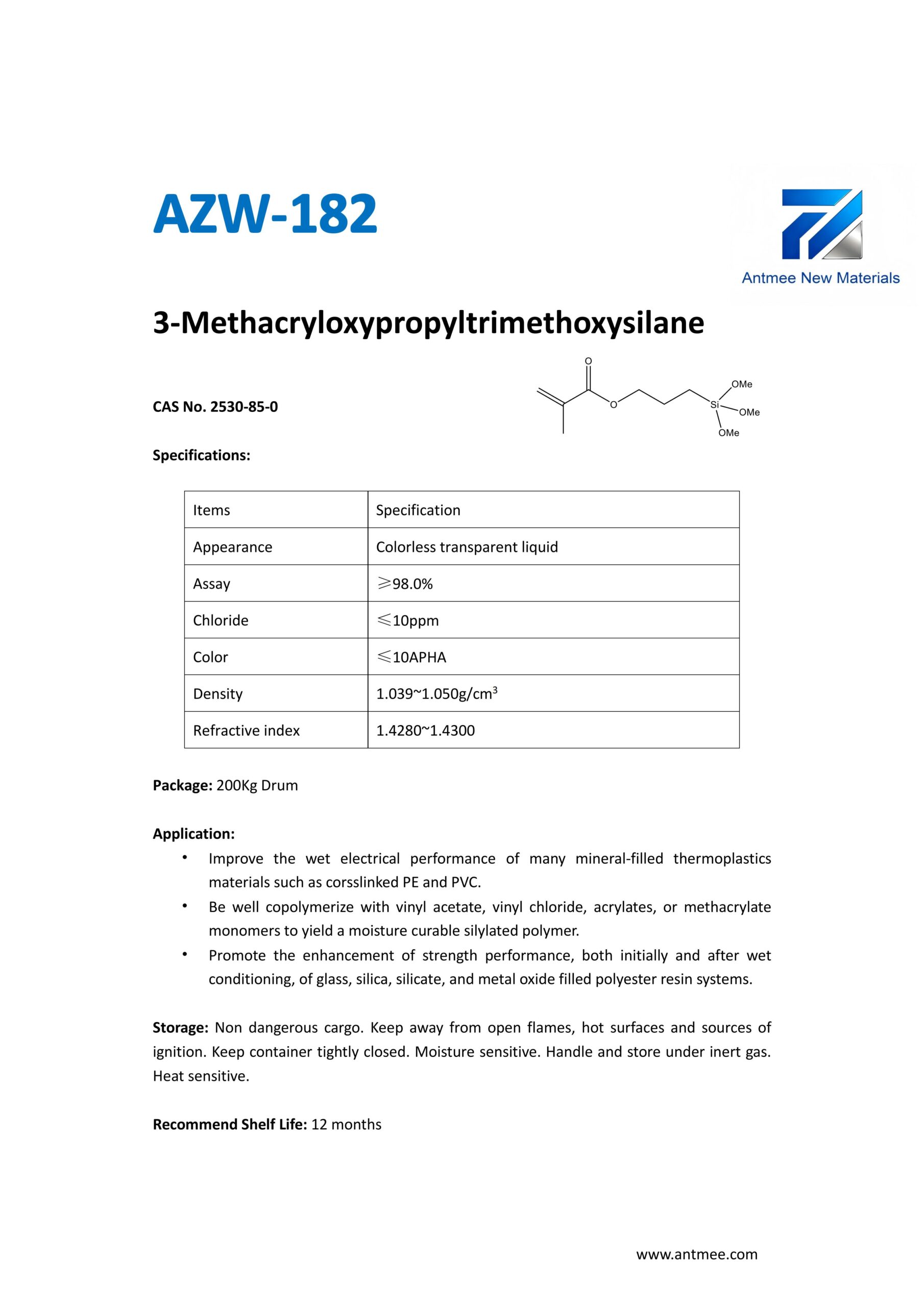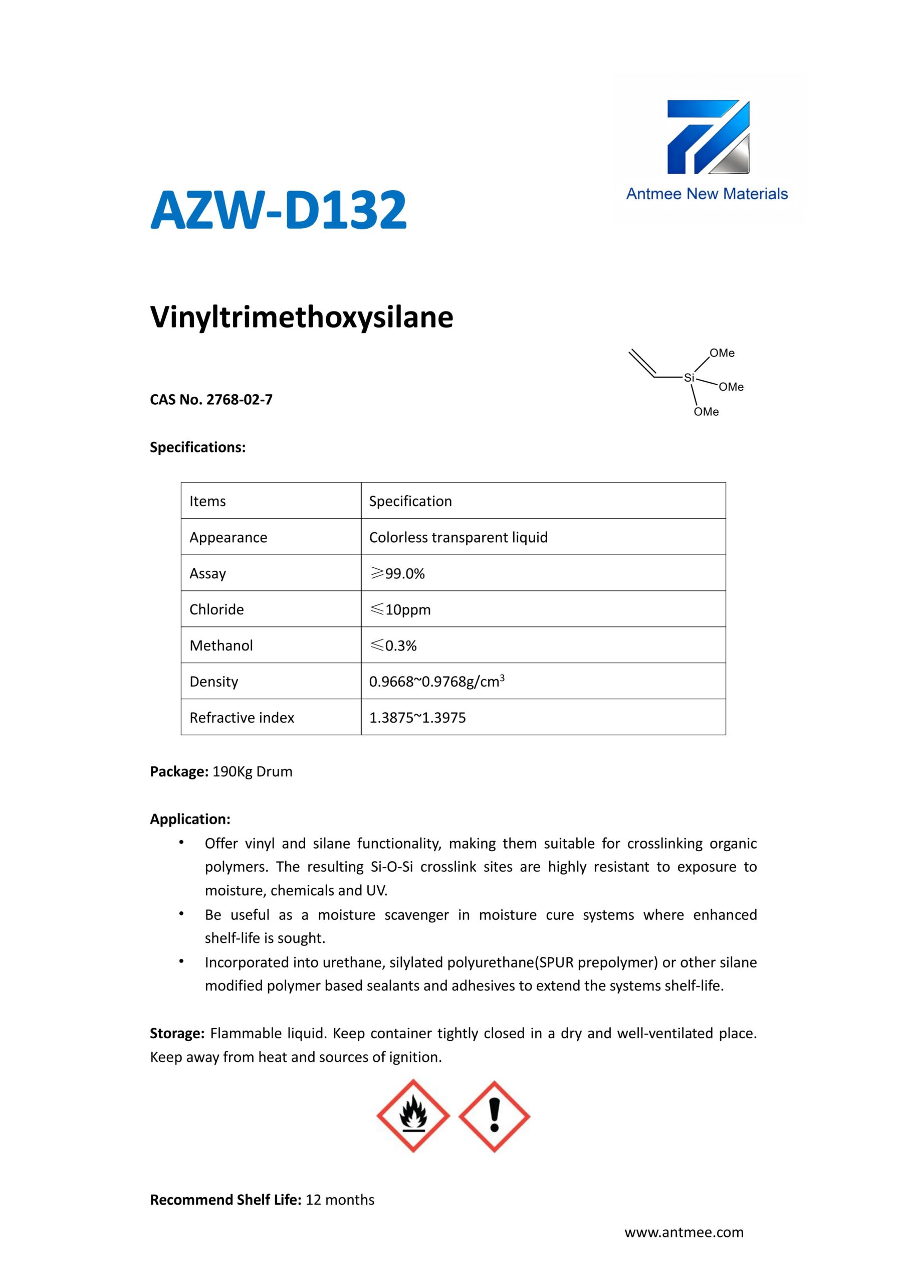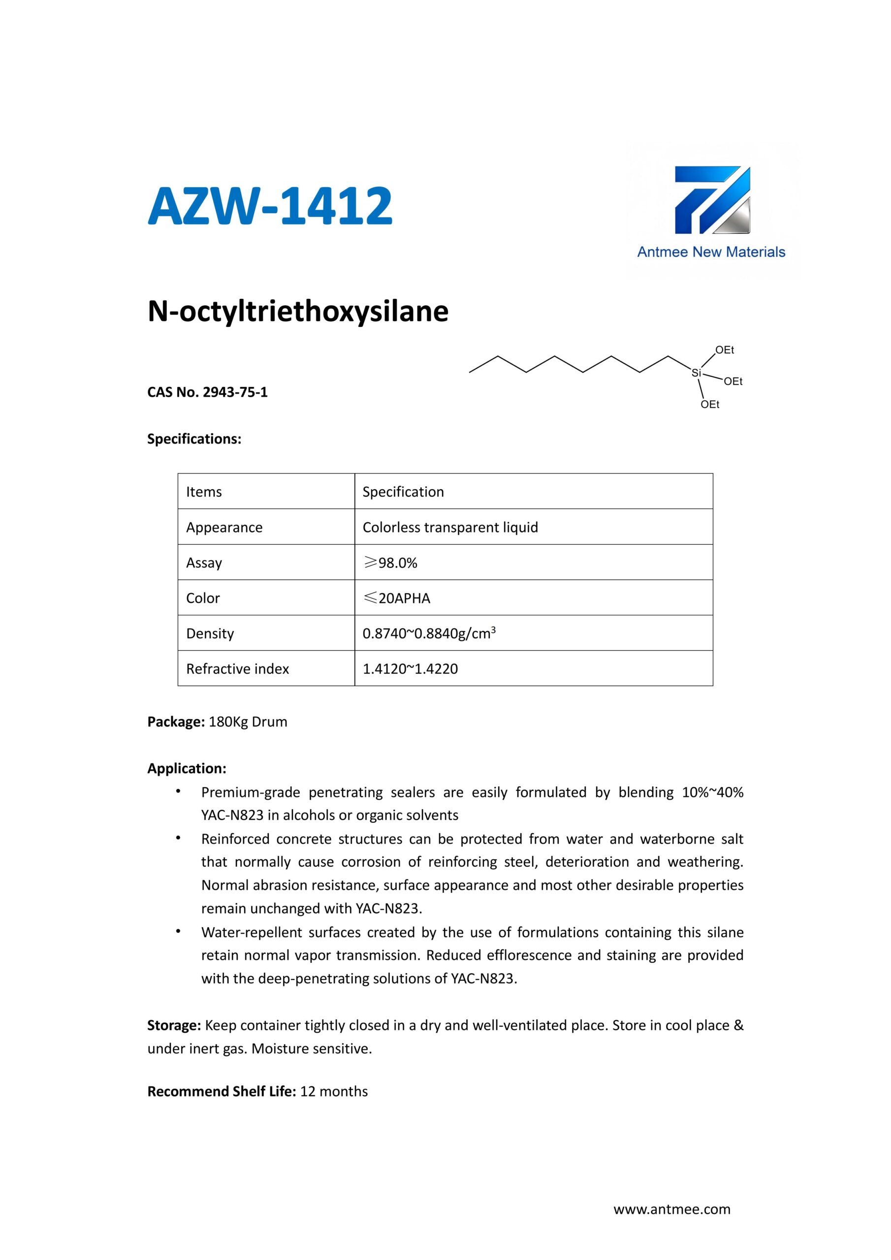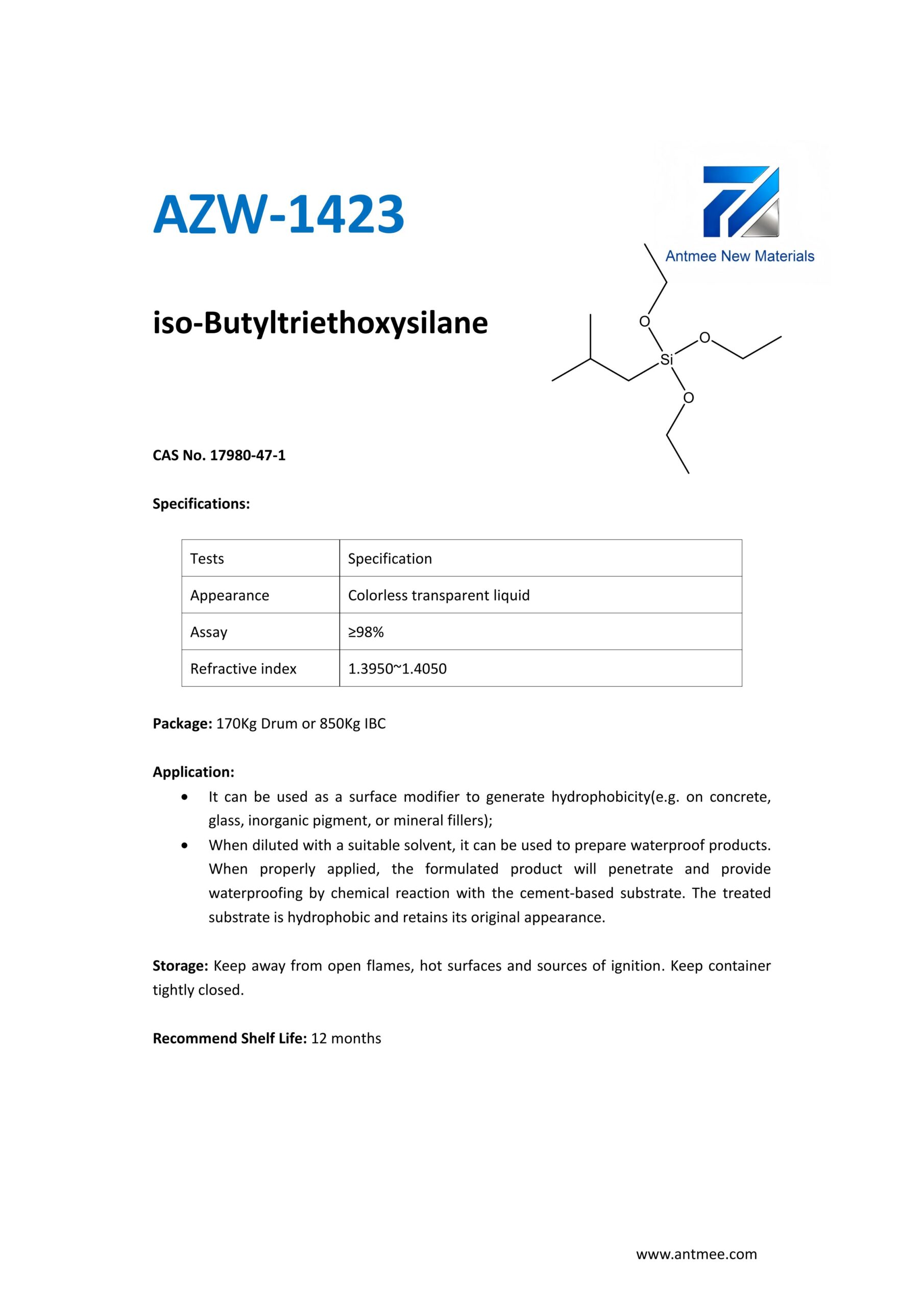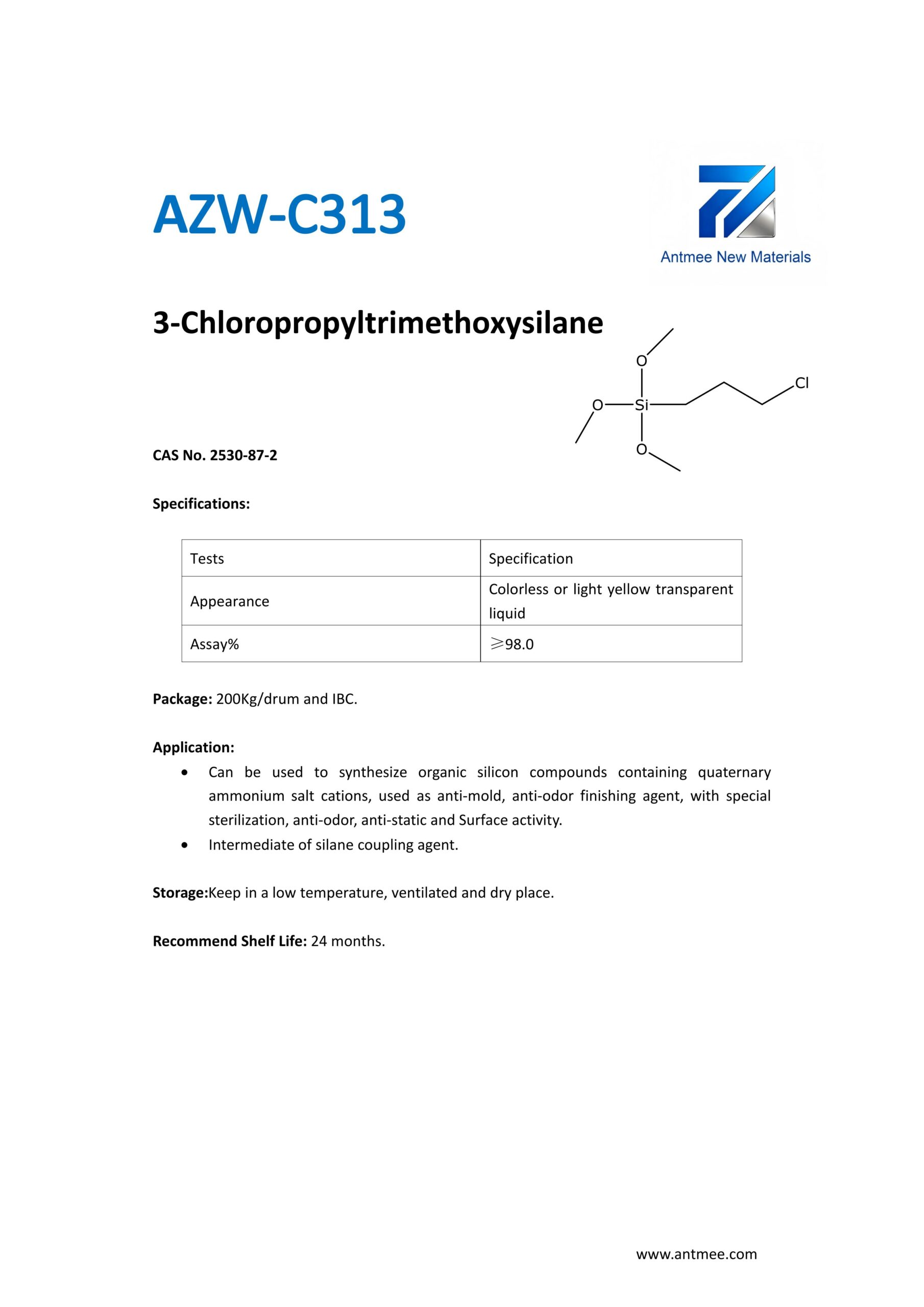 Silane Series Silane Series AZW-1412 CAS No. 2943-75-1N-octyltriethoxysilaneProduct details AZW-1423 CAS No. 17980-47-1iso-ButyltriethoxysilaneProduct details AZW-1111 CAS No.13822-56-53-AminopropyltrimethoxysilaneProduct details YAC-A112 CAS No.1760-24-3N-aminoethyl-3-aminopropyltrimethoxysilaneProduct details AZW-3110 CAS No.919-30-23-AMINOPROPYL TRI ETHOXY SILANEProduct details AZW-1323 CAS No. 24801-88-53-IsocyanatopropyltriethoxysilaneProduct details AZW-1050 CAS No. 15396-00-63-IsocyanatopropyltrimethoxysilaneProduct details AZW-1133 CAS No. 3277-26-71,1,3,3-TetramethyldisiloxaneProduct details AZW-H1010 CAS No. 83048-65-11H,1H,2H,2H-perfluorodecyltrimethoxysilaneProduct details AZW-C1150 CAS No. 17865-32-6CyclohexyldimethoxymethylsilaneProduct details AZW-1312 CAS No. 1112-39-6DimethoxydimethylsilaneProduct details AZW-A125 CAS No. 3069-29-2N-aminoethyl-3-aminopropylmethyldimethoxysilaneProduct details AZW-E233 CAS No. 3663-44-33-AminopropylmethyldimethoxysilaneProduct details AZW-C313 CAS No. 2530-87-23-ChloropropyltrimethoxysilaneProduct details AZW-O1848 CAS No. 2897-60-13-GlycidoxypropylmethyldiethoxysilaneProduct details AZW-0115 CAS No. 2530-83-83-GlycidoxypropyltrimethoxysilaneProduct details AZW-182 CAS No. 2530-85-03-MethacryloxypropyltrimethoxysilaneProduct details AZW-D4 CAS No. 556-67-2Octamethylcyclotetrasiloxane(D4)Product details AZW-AOS CAS No. 2224-33-1Vinyltris(methylethylketoxime)silaneProduct details AZW-D132 CAS No. 2768-02-7VinyltrimethoxysilaneProduct details Need Help with Easier Industrial Solutions? We Are Experts! Learn More