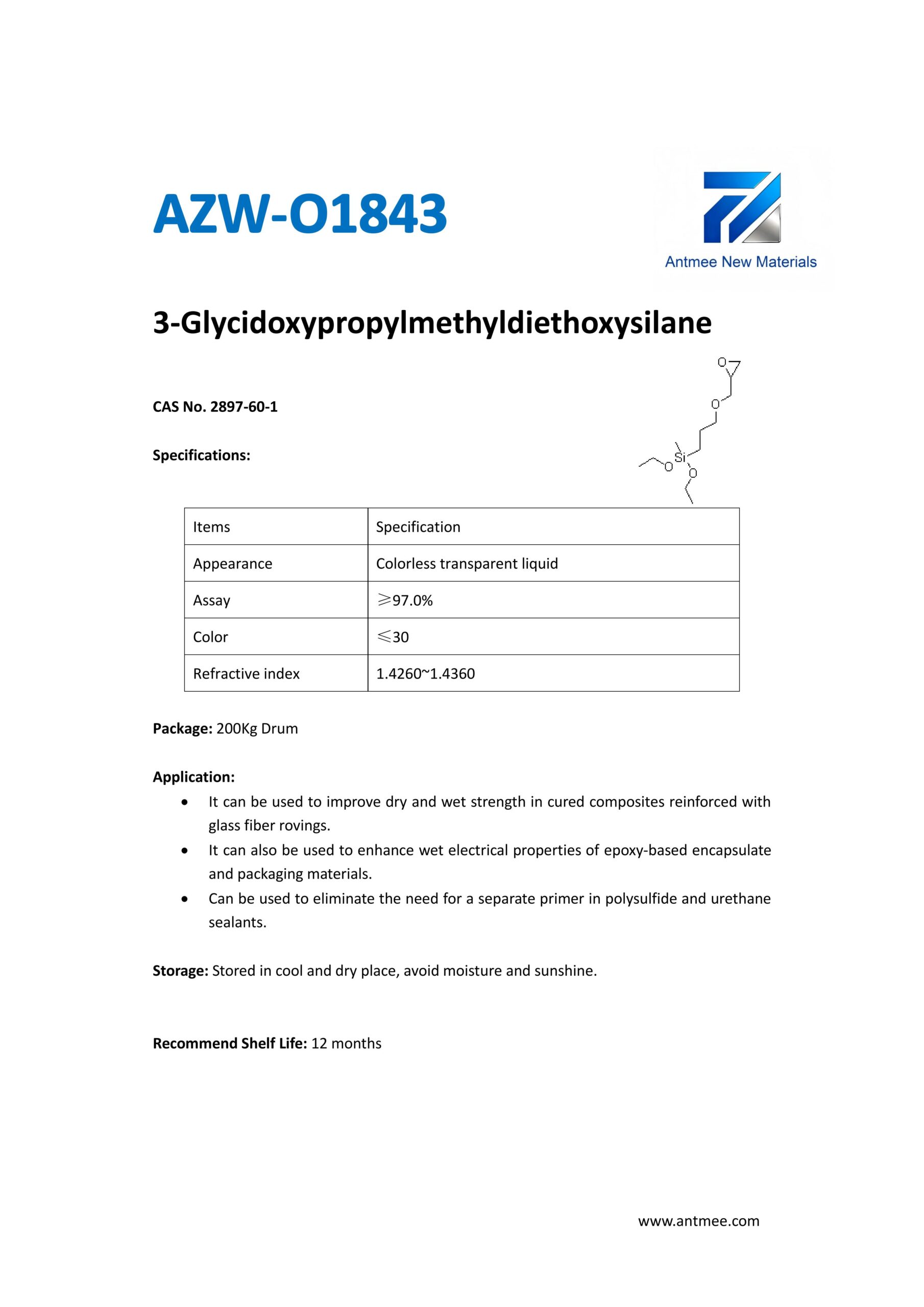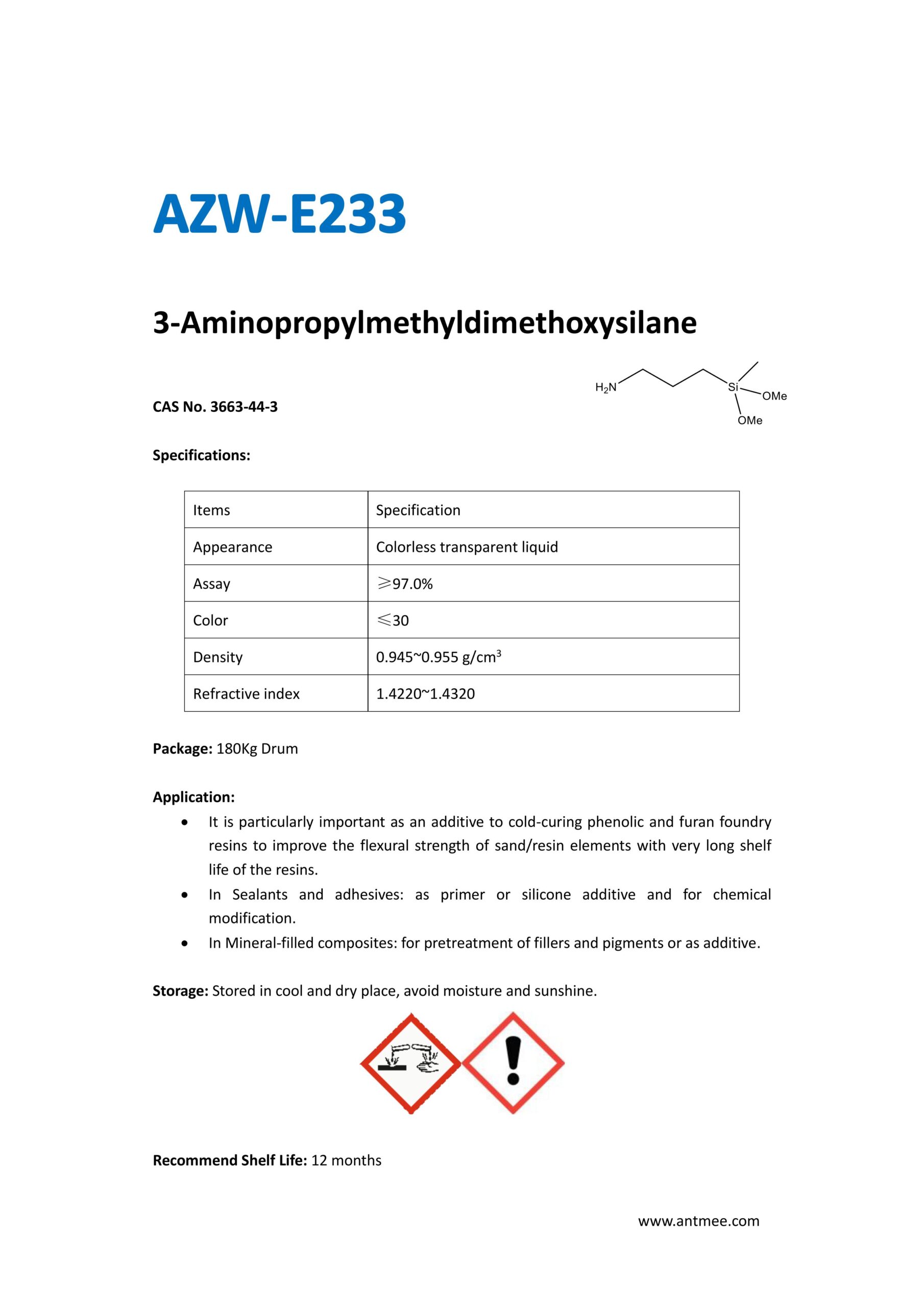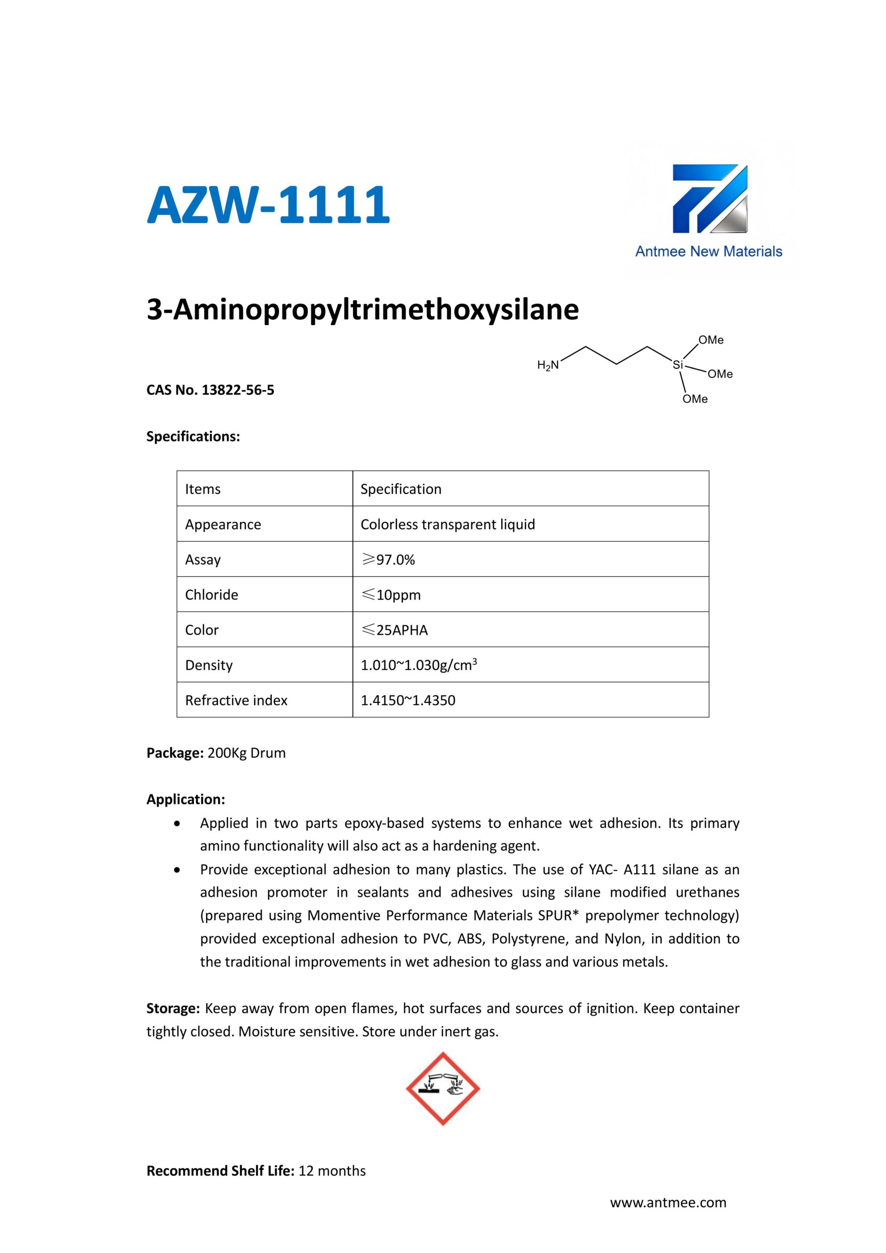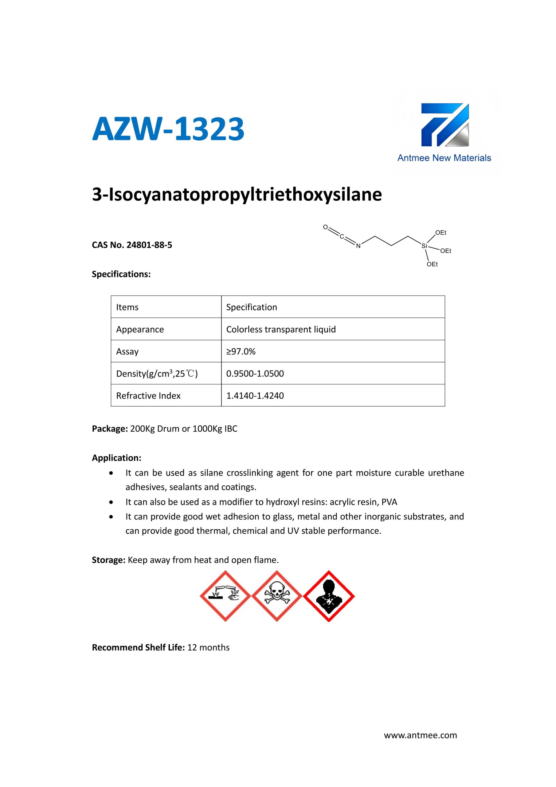 Silane Series Silane Series AZW-1412 CAS No. 2943-75-1N-octyltriethoxysilaneProduct details AZW-1423 CAS No. 17980-47-1iso-ButyltriethoxysilaneProduct details AZW-1111 CAS No.13822-56-53-AminopropyltrimethoxysilaneProduct details YAC-A112 CAS No.1760-24-3N-aminoethyl-3-aminopropyltrimethoxysilaneProduct details AZW-3110 CAS No.919-30-23-AMINOPROPYL TRI ETHOXY SILANEProduct details AZW-1323 CAS No. 24801-88-53-IsocyanatopropyltriethoxysilaneProduct details AZW-1050 CAS No. 15396-00-63-IsocyanatopropyltrimethoxysilaneProduct details AZW-1133 CAS No. 3277-26-71,1,3,3-TetramethyldisiloxaneProduct details AZW-H1010 CAS No. 83048-65-11H,1H,2H,2H-perfluorodecyltrimethoxysilaneProduct details AZW-C1150 CAS No. 17865-32-6CyclohexyldimethoxymethylsilaneProduct details AZW-1312 CAS No. 1112-39-6DimethoxydimethylsilaneProduct details AZW-A125 CAS No. 3069-29-2N-aminoethyl-3-aminopropylmethyldimethoxysilaneProduct details AZW-E233 CAS No. 3663-44-33-AminopropylmethyldimethoxysilaneProduct details AZW-C313 CAS No. 2530-87-23-ChloropropyltrimethoxysilaneProduct details AZW-O1848 CAS No. 2897-60-13-GlycidoxypropylmethyldiethoxysilaneProduct details AZW-0115 CAS No. 2530-83-83-GlycidoxypropyltrimethoxysilaneProduct details AZW-182 CAS No. 2530-85-03-MethacryloxypropyltrimethoxysilaneProduct details AZW-D4 CAS No. 556-67-2Octamethylcyclotetrasiloxane(D4)Product details AZW-AOS CAS No. 2224-33-1Vinyltris(methylethylketoxime)silaneProduct details AZW-D132 CAS No. 2768-02-7VinyltrimethoxysilaneProduct details Need Help with Easier Industrial Solutions? We Are Experts! Learn More