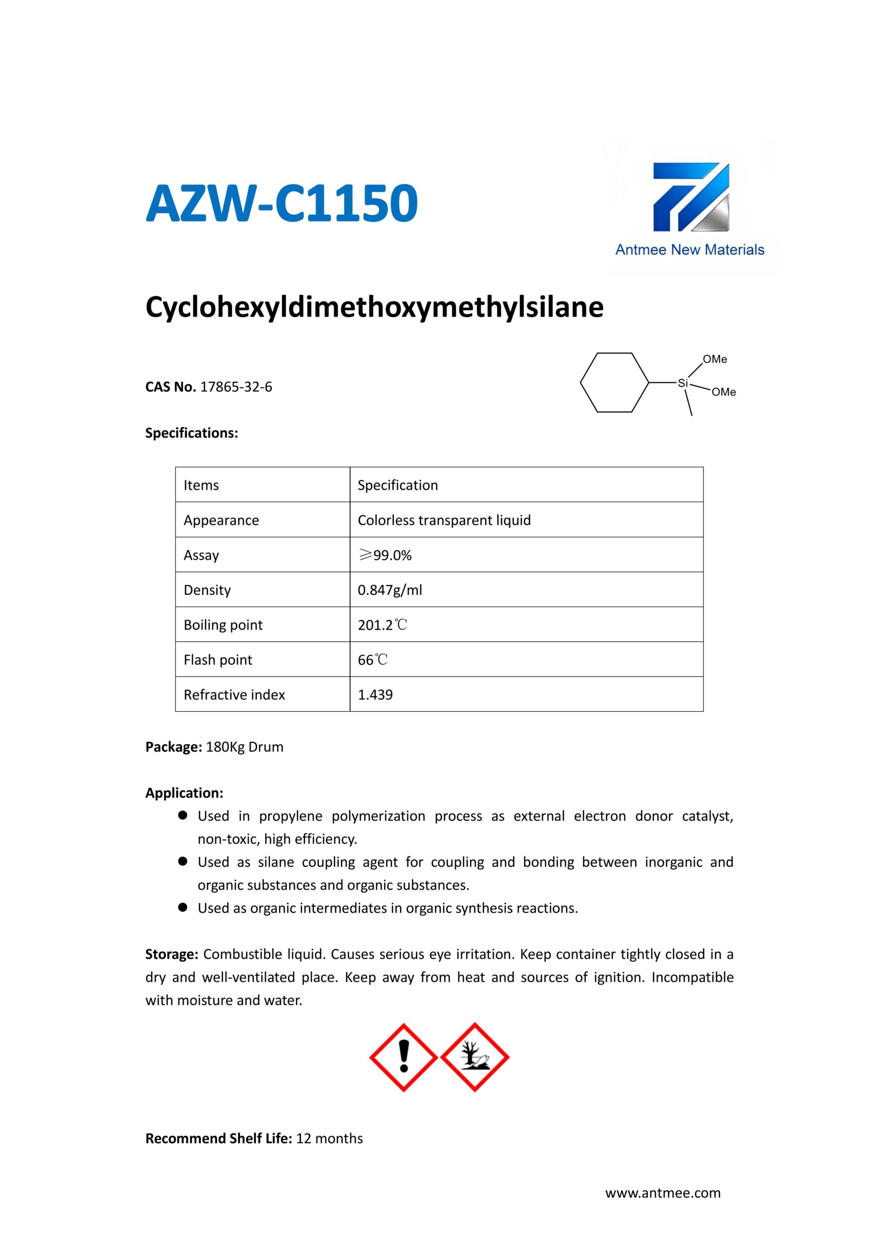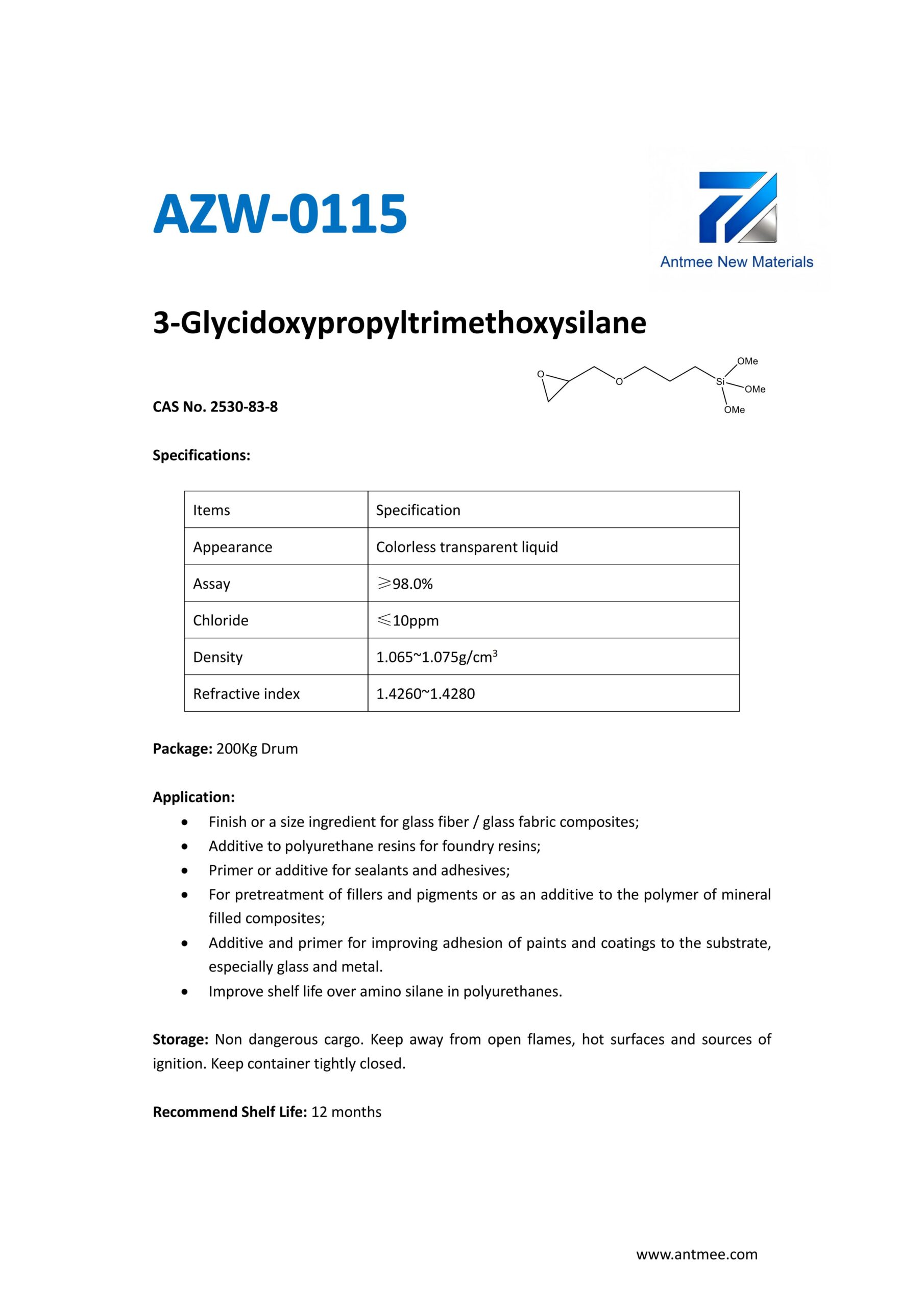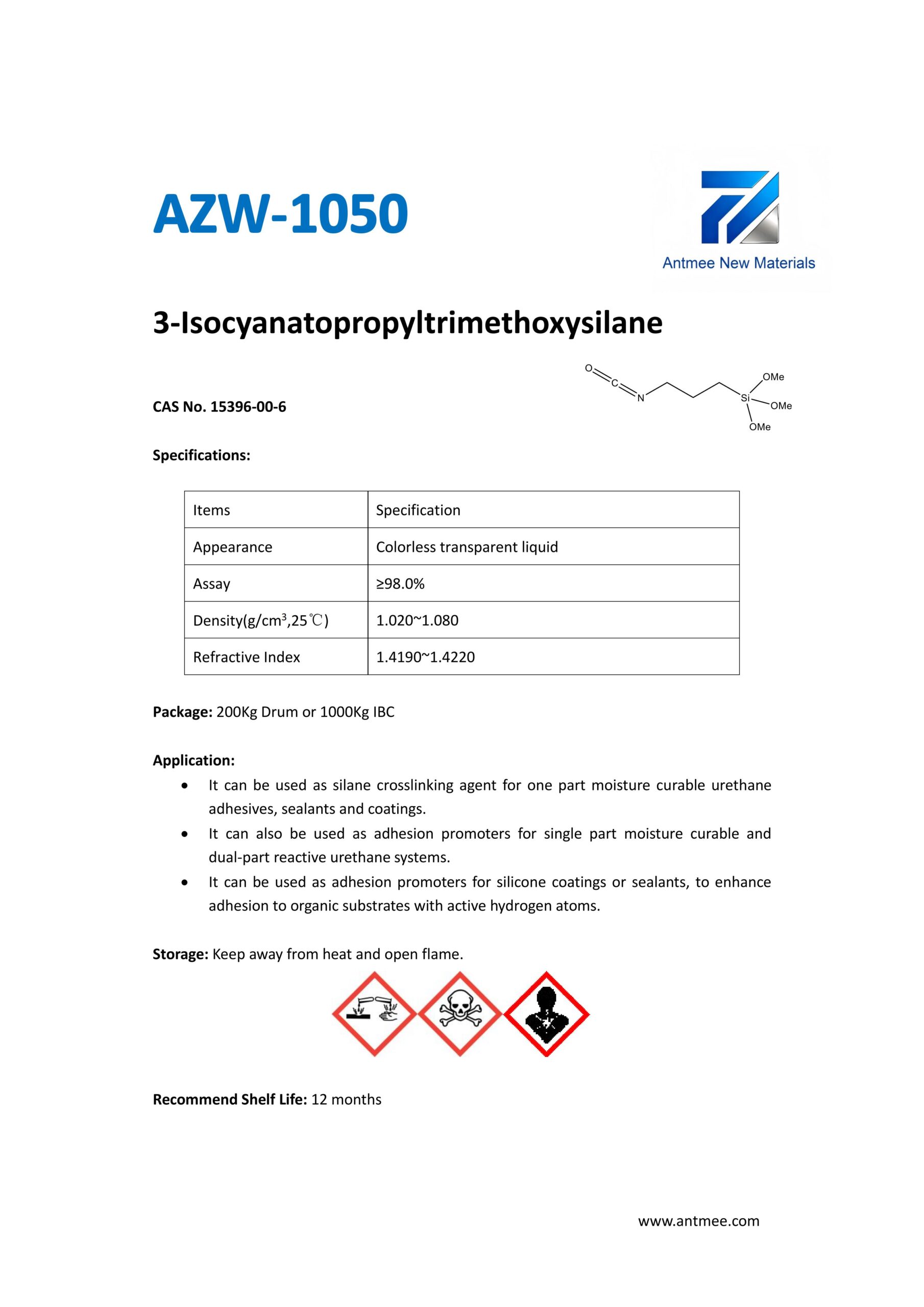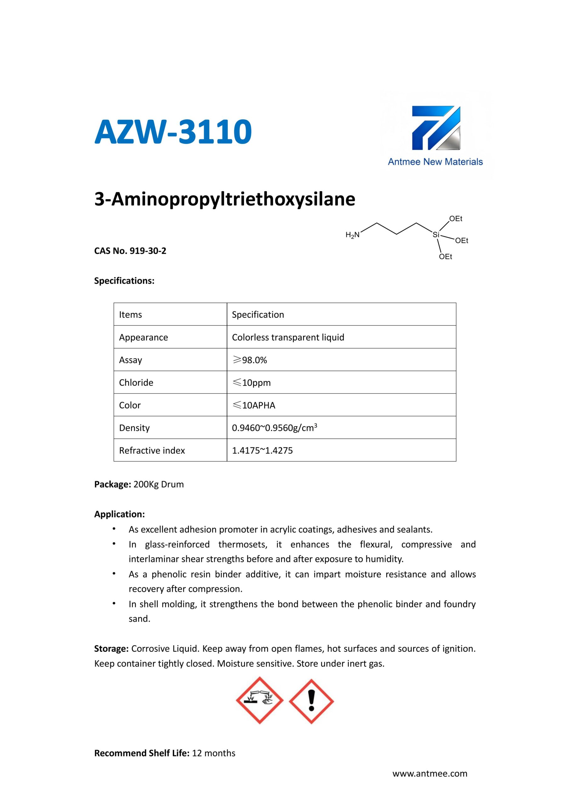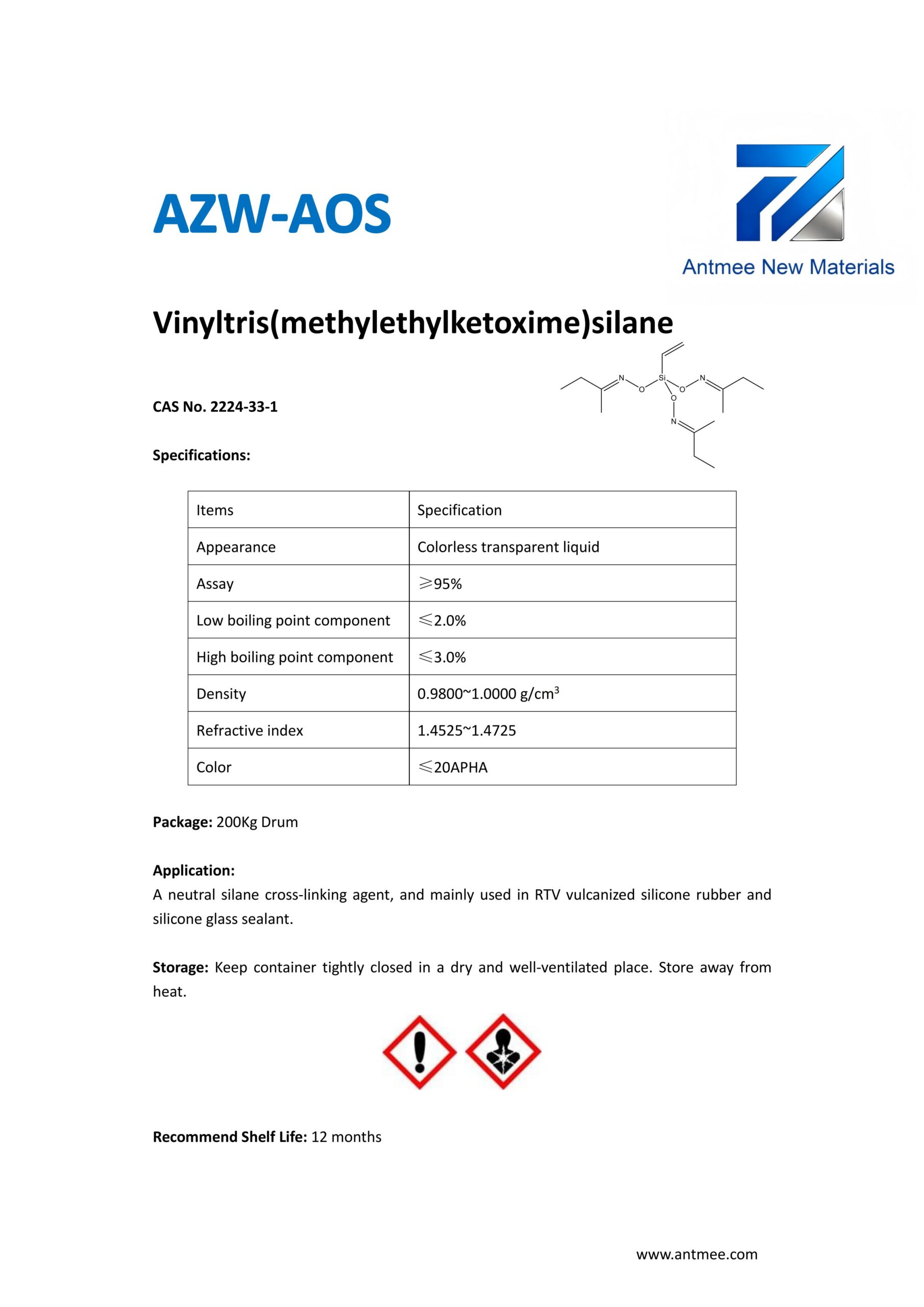 Silane Series Silane Series AZW-1412 CAS No. 2943-75-1N-octyltriethoxysilaneProduct details AZW-1423 CAS No. 17980-47-1iso-ButyltriethoxysilaneProduct details AZW-1111 CAS No.13822-56-53-AminopropyltrimethoxysilaneProduct details YAC-A112 CAS No.1760-24-3N-aminoethyl-3-aminopropyltrimethoxysilaneProduct details AZW-3110 CAS No.919-30-23-AMINOPROPYL TRI ETHOXY SILANEProduct details AZW-1323 CAS No. 24801-88-53-IsocyanatopropyltriethoxysilaneProduct details AZW-1050 CAS No. 15396-00-63-IsocyanatopropyltrimethoxysilaneProduct details AZW-1133 CAS No. 3277-26-71,1,3,3-TetramethyldisiloxaneProduct details AZW-H1010 CAS No. 83048-65-11H,1H,2H,2H-perfluorodecyltrimethoxysilaneProduct details AZW-C1150 CAS No. 17865-32-6CyclohexyldimethoxymethylsilaneProduct details AZW-1312 CAS No. 1112-39-6DimethoxydimethylsilaneProduct details AZW-A125 CAS No. 3069-29-2N-aminoethyl-3-aminopropylmethyldimethoxysilaneProduct details AZW-E233 CAS No. 3663-44-33-AminopropylmethyldimethoxysilaneProduct details AZW-C313 CAS No. 2530-87-23-ChloropropyltrimethoxysilaneProduct details AZW-O1848 CAS No. 2897-60-13-GlycidoxypropylmethyldiethoxysilaneProduct details AZW-0115 CAS No. 2530-83-83-GlycidoxypropyltrimethoxysilaneProduct details AZW-182 CAS No. 2530-85-03-MethacryloxypropyltrimethoxysilaneProduct details AZW-D4 CAS No. 556-67-2Octamethylcyclotetrasiloxane(D4)Product details AZW-AOS CAS No. 2224-33-1Vinyltris(methylethylketoxime)silaneProduct details AZW-D132 CAS No. 2768-02-7VinyltrimethoxysilaneProduct details Need Help with Easier Industrial Solutions? We Are Experts! Learn More